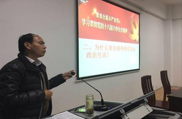 为深入学习贯彻党的十八届六中全会精神,2016年12月20日晚上7:00,杨善洲干部学院在培训楼202教室组织学习“党的十八届六中全会宣讲报告”,施甸县县委宣传部副部长、施甸县社科联主席何显祥老师给学院干部职工作了报告,杨善洲精神教育基地管理委员会主任李富强同志参加了报告会,报告会由管委会副主任周波同志主持。何显祥老师用“一个主题,两大板块,三份文件,四个全面,五个反对,六个不准,七个禁止,八个不允许”来围绕着全面从严治党的主题进行宣讲,强调了党的十八届六中全会围绕理论、思想、制度构建体系,围绕权力、责任、担当推动解决党内政治生活庸俗化、随意化、平淡化和党内监督制度不健全、覆盖不到位、责任不明确、执行不力等问题。报告核心明确、立意精准、语言生动,全体干部职工深刻地领会了十八届六中全会精神会。
